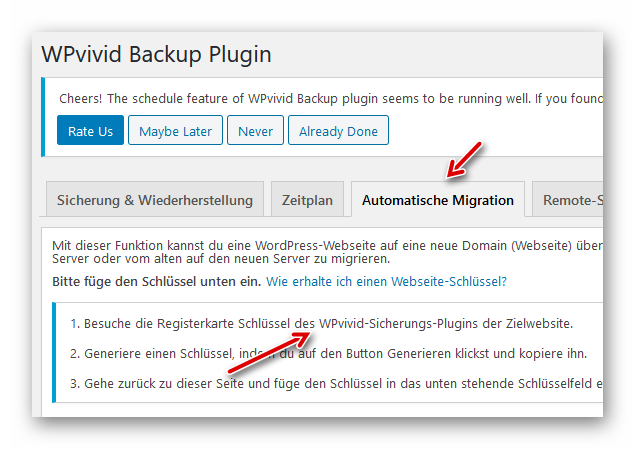 Wir klicken im Dashboard der Quellwebsite links auf WPvivid Backup und dann auf das Register “Automatische Migration”. Gemäß der Aufforderung unter Punkt 1 wechseln wir auf die Zielwebsite: