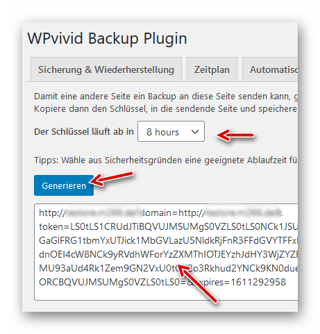 …dann auf “Generieren”und erzeugen einen Schlüssel. Dieser läuft bei unserem Beispiel in 8 Std. ab. Wir kopieren den Schlüssel aus dem unteren Feld (lange Buchstaben-/Zahlenkolonne),…