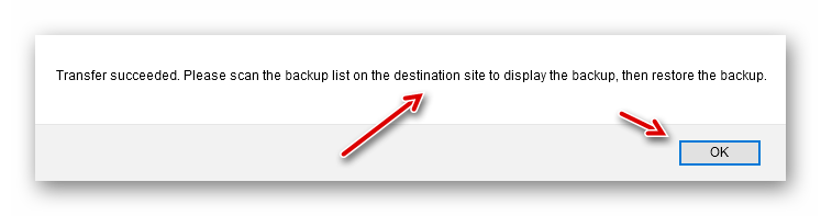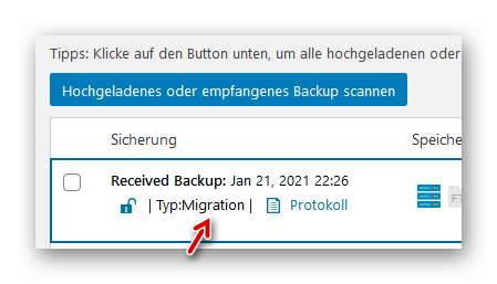 Das übertragende Backup (Typ:Migration) wurde gefunden: