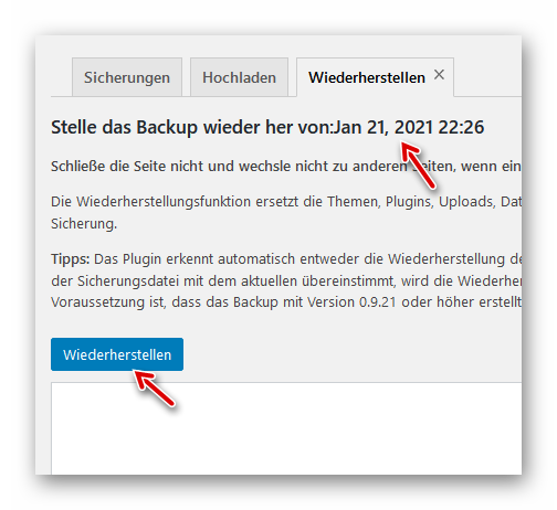 Prüfen, ob das richtige Backup ausgewählt wurde und auf “Wiederherstellen” klicken: