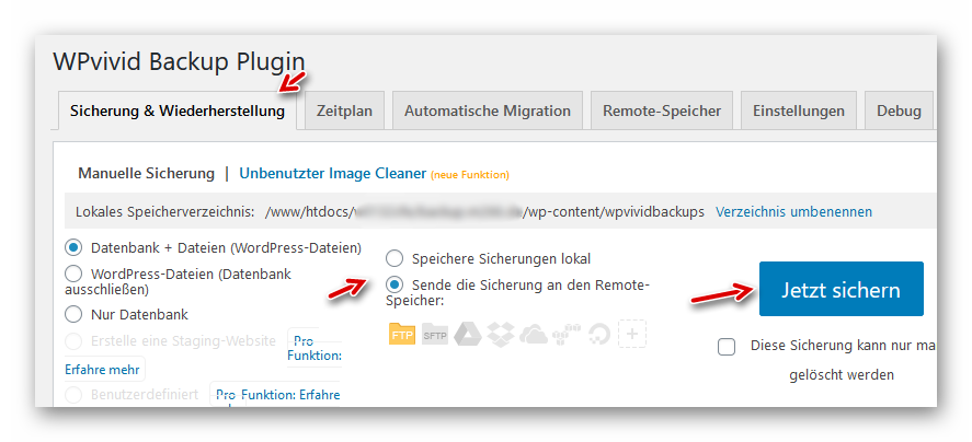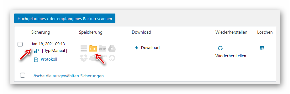 Heruntergeladene Backups können archiviert und von Zeit zu Zeit auch wieder gelöscht werden, um Platz auf der Festplatte zu sparen.