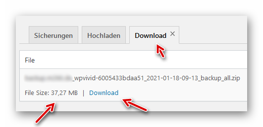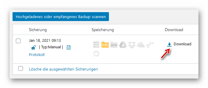 Als zusätzliche Sicherheit sollte das Backup regelmäßig auf den eigenen Rechner heruntergeladen werden. Dazu klicken wir auf “Download”…