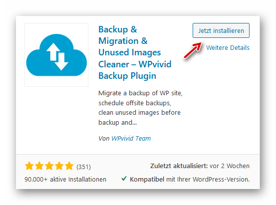 Wir öffnen das Dashboard und klicken auf Plugins -> Installieren. Im Suchfenster geben wir “WPvivid” ein und installieren das im Bild gezeigte Plugin: