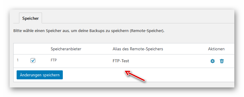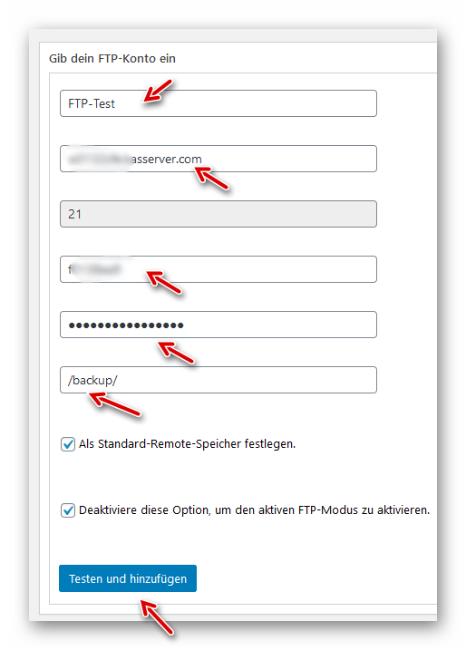 …und füllen das Formular mit unseren Daten für einen FTP-Zugang (muss bereits angelegt sein) aus. Nach dem Speichern der Einstellungen erfolgt mit Klick auf den blauen Button unten der Test unserer FTP-Verbindung: