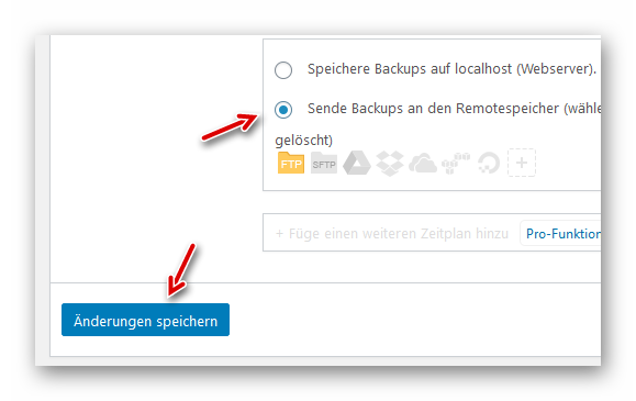 Die Auswahl dieser Speicherorte wird NICHT empfohlen, da die Sicherung in der kostenlosen Version des Plugins nicht verschlüsselt ist und die Datenspeicherung außerhalb der EU erfolgt (nicht DSGVO-konform):