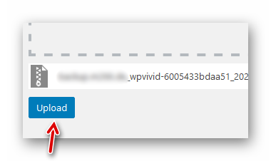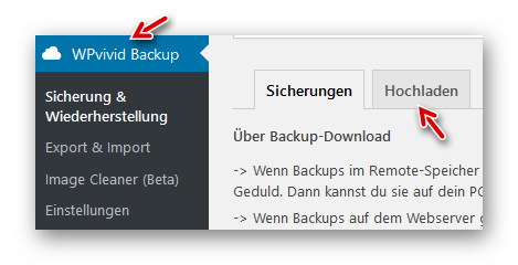 Wir loggen uns im Dashboard ein und klicken auf WPvivid -> Hochladen: