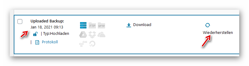 Die aktuelle Zeile für unser hochgeladenes Backup ist durch eine Umrahmung hervorgehoben. Der Klick auf den Link “Wiederherstellen” starten den Restore-Prozess: