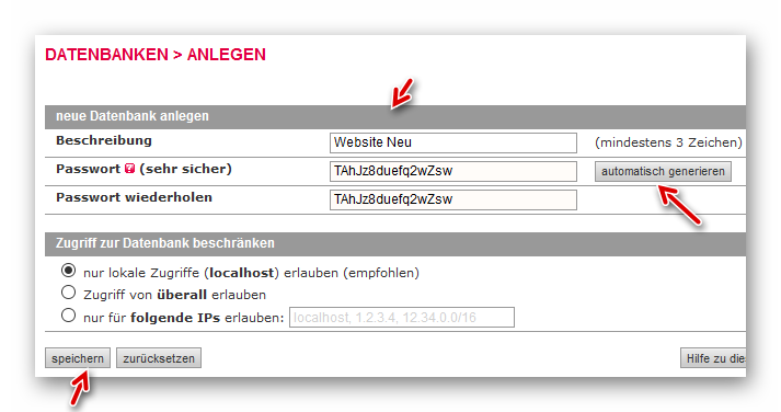 Dann erstellen wir eine neue Datenbank mit autom. generiertem Passwort: