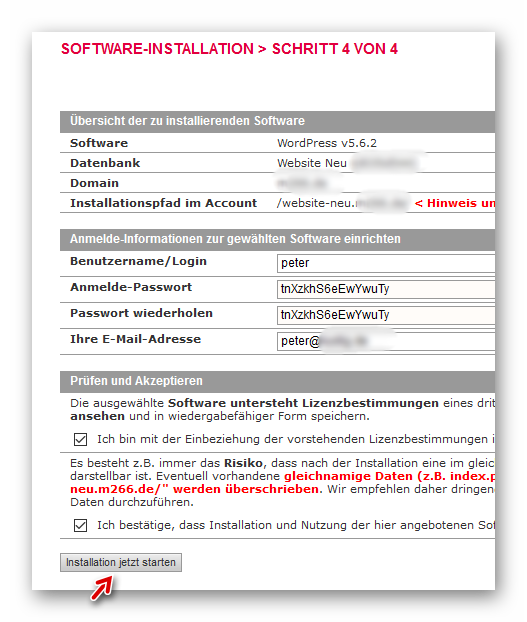 …und dann in diesem Formular alle erforderlichen Angaben eintragen. Mit dem Button am Ende wird WordPress im neuen Root-Ordner installiert: