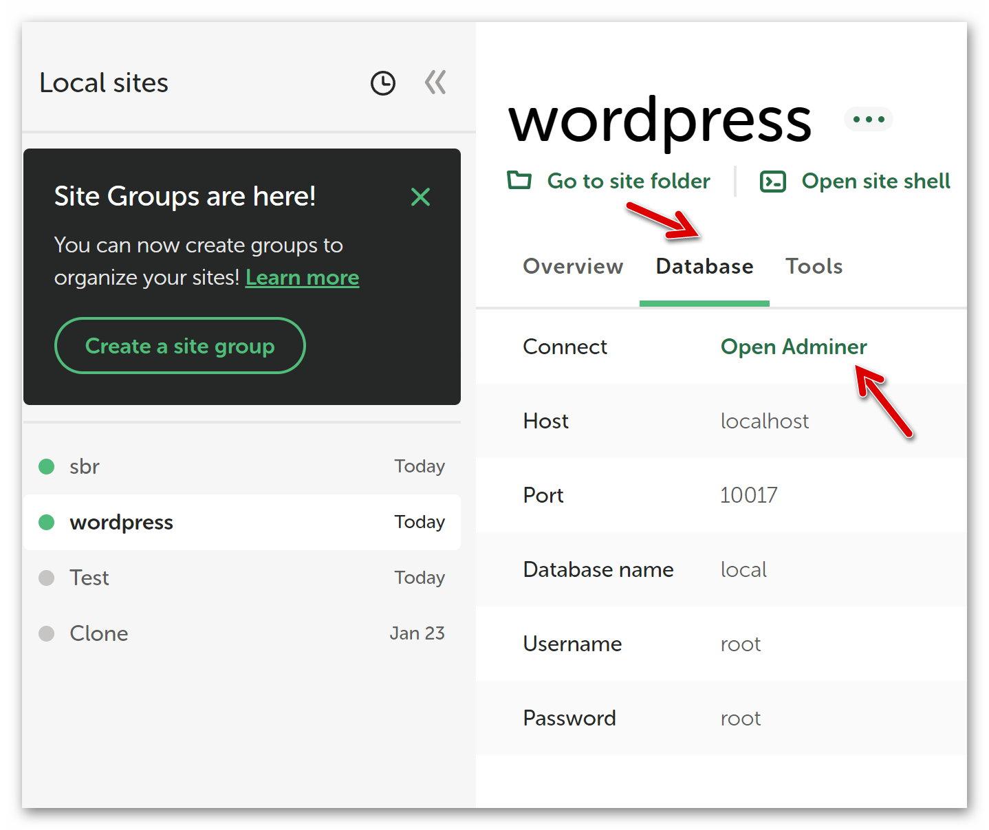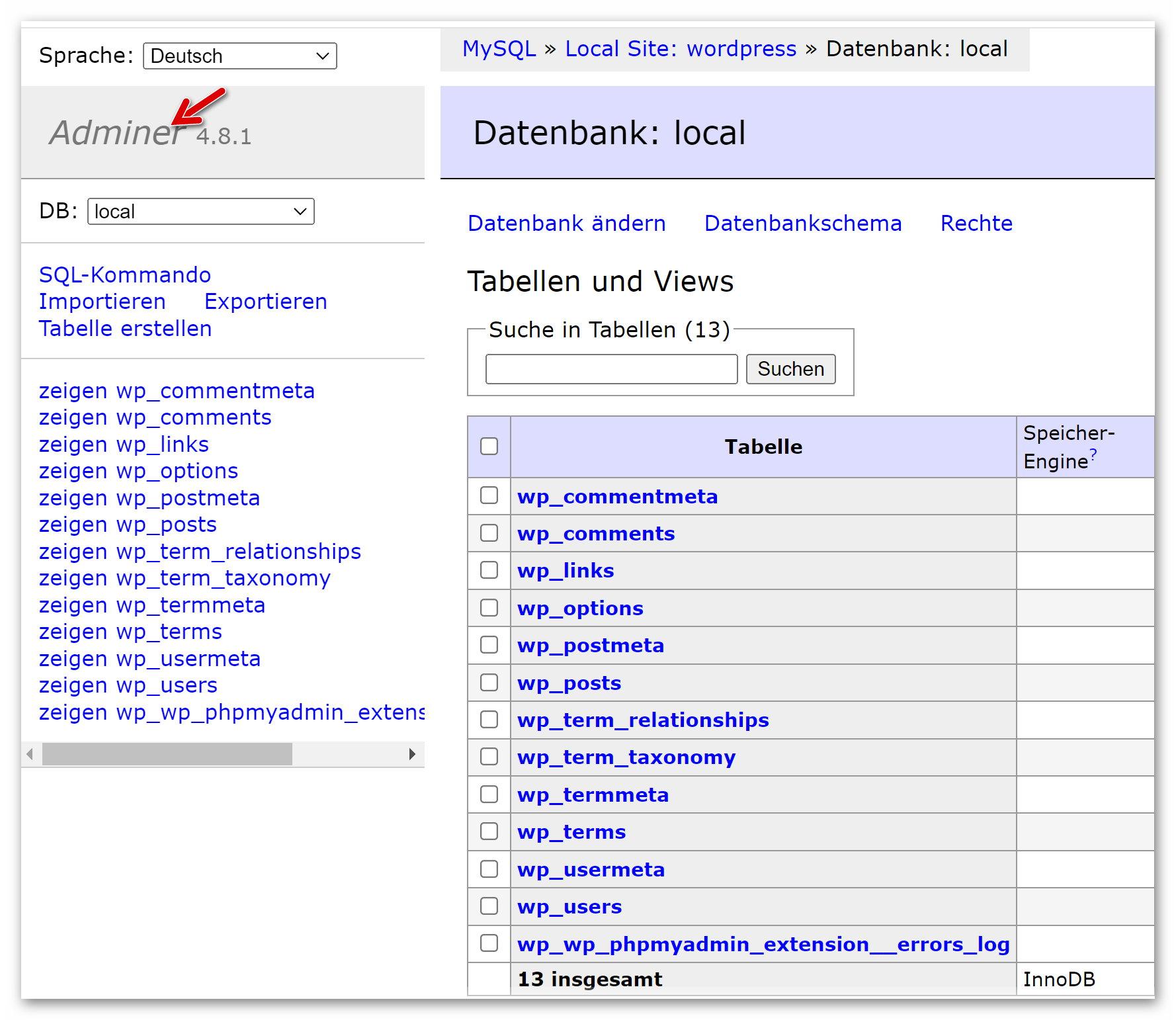 Datenbank Start Software Lokaler Webserver Local WP Datenbank Die Tabellen der Datenbank lassen sich… …mit dem Open Adminer bearbeiten: