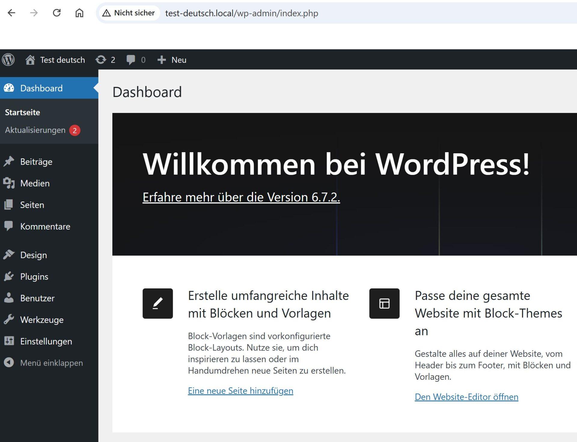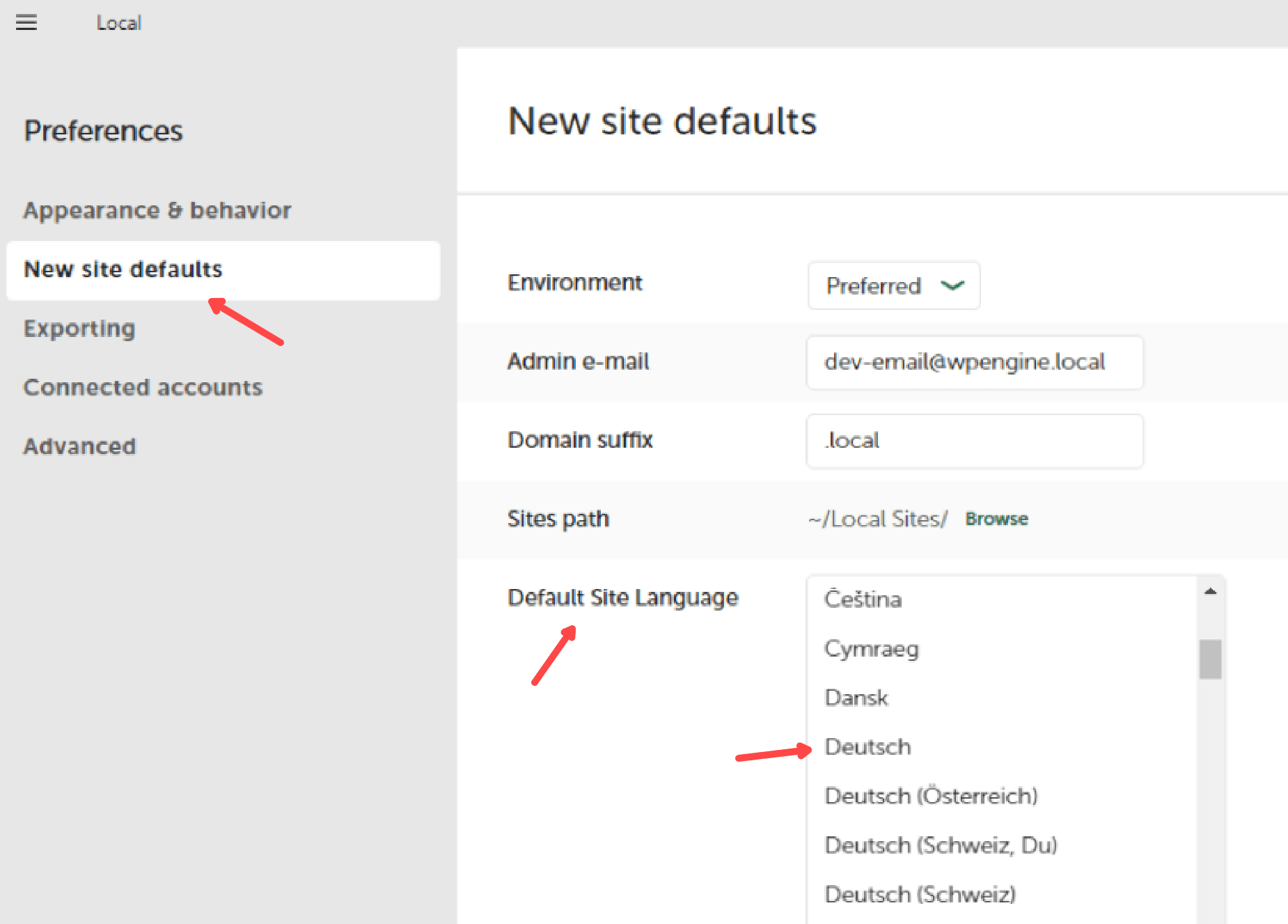 Wir klicken auf den Button „New site defaults“, um wie gezeigt die Sprache für neue Websites auf Deutsch umzustellen: