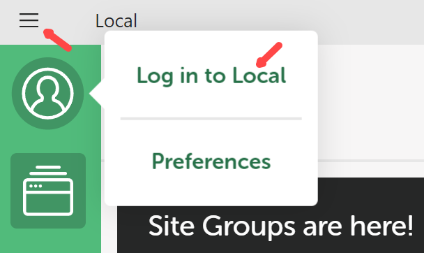 Auf den „Hamburger“ links oben und dann auf „Log in to Local“ klicken: