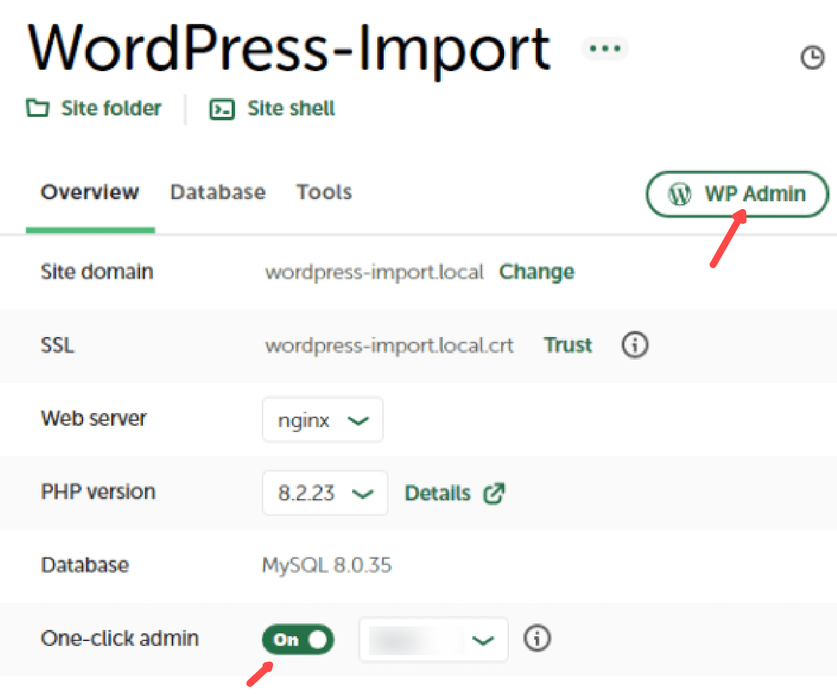 Wir betätigen den Schalter „One-click admin“ und klicken dann auf den oberen Button „WP Admin“:
