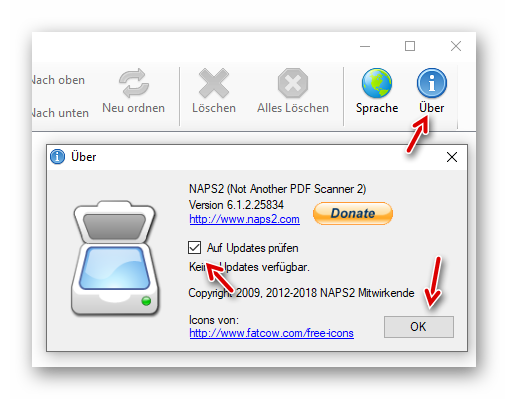 Um künftig Updates zu erhalten, klicken wir auf “Über”, setzen das gezeigte Häkchen und bestätigen mit OK: