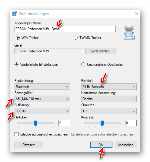 Hier sind zwei Scanner vorhanden. Wir markieren für das Beispiel den Epson Scanner V39 und bestätigen mit OK: