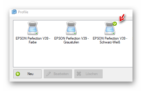 Profile erleichtern den Wechsel zu vorher definierten Einstellungen. Damit kann z. B. schnell von Einstellungen mit Farbe (für Fotos) zu Graustufen- oder Schwarz-Weiß-Einstellungen umgeschaltet werden. Ebenso kann, sofern vorhanden, zwischen mehreren Scannern (Flachbett-Scanner, All-in-one-Drucker mit Scanfunktion usw.) gewechselt werden.
