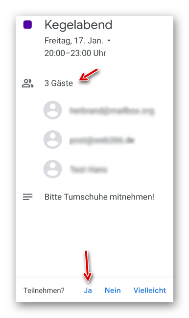 Mit uns sind es dann 3 Teilnehmer (Gäste). Zum Eintragen in den Kalender klicken wir auf “Ja”: