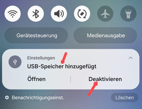 Am Handy lassen sich zum Datentausch bequem USB-Sticks, SSD-HDs usw. anschließen. Beim Abziehen eines USB-Sticks kommt regelmäßig auf dem Handy die Warnung, dass ein Medium entfernt wurde und das Handy neu gestartet werden muss.