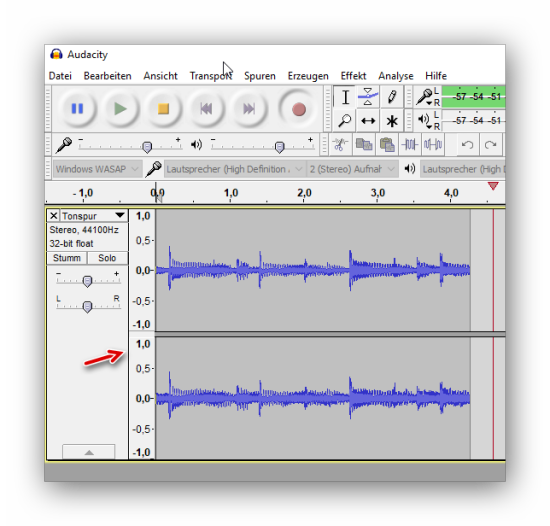Hier ist die laufende Aufnahme mit Pegelanzeige zu sehen: