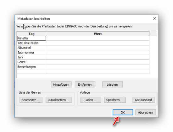 Bei Bedarf lassen sich noch zusätzlich Metadaten eintragen. Danach auf OK klicken: