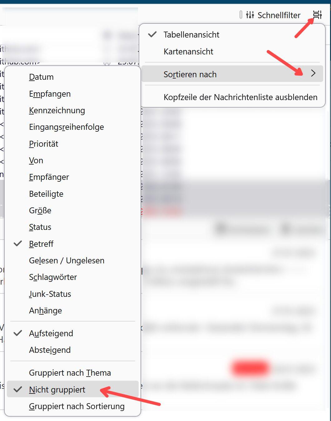 Dann auf „Sortieren nach“ klicken und den Eintrag „Nicht gruppiert“ aktivieren: