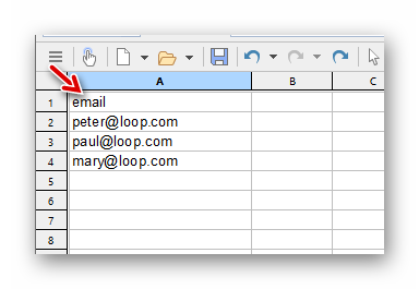 Die Empfängerliste mit den E-Mail-Adressen muss in einer Excel-Tabelle im CSV-Format vorliegen und eine Spaltenüberschrift (hier: email) haben: