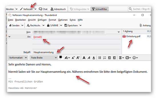 Wir klicken in Thunderbird auf “Verfassen” und fügen unseren Text sowie ggf. eine Anlage bei. Im “An-Feld” wird die Spaltenüberschrift aus der Excel-Tabelle mit doppelt geschweifter Klammer am Anfang und Ende eingefügt {{email}}:
