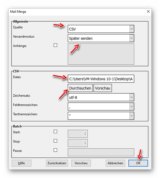 Unter Allgemein die Quelle “CSV”, den Versandmodus “Später senden” auswählen und die Excel-Datei mit “Durchsuchen” einbinden. Dann auf OK klicken: