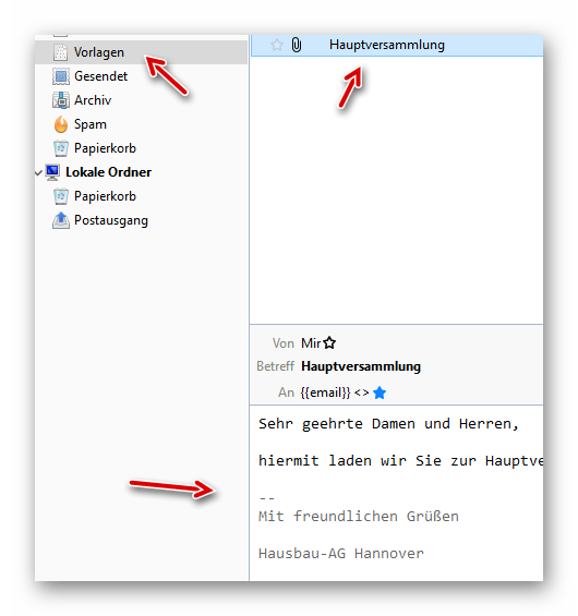 Die gesendete E-Mail liegt zur späteren Verwendung nun im Ordner “Vorlagen” bereit: