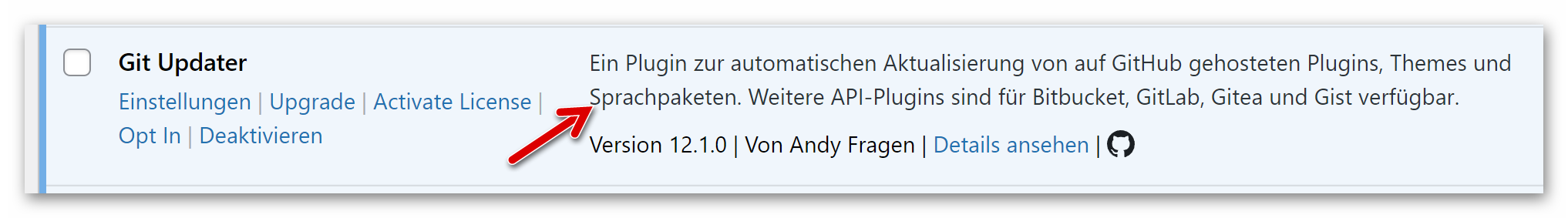 In einigen Fällen wird der Update-Vorgang des Plugins „Git Updater“ nicht sauber durchgeführt. Dann muss das Plugin gelöscht und neu installiert werden. Das Einschalten der automatischen Aktualisierung wird empfohlen. I. d. R. muss das Plugin nach der Installation noch aktiviert werden!