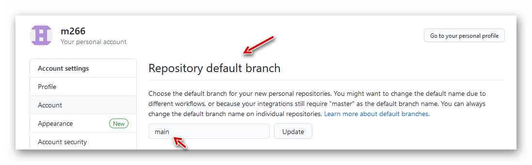 Hier ist von älteren Repos der Eintrag „main“ zu sehen, was aktuell (April 2021) nicht mehr funktioniert: