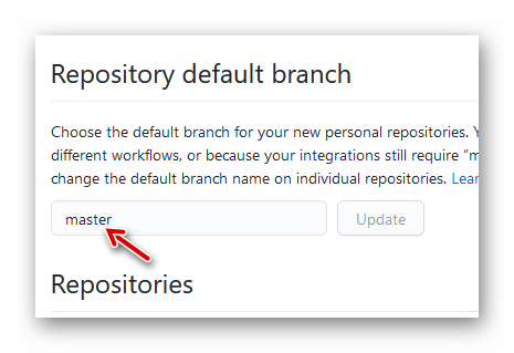 Wir ändern die Vorgabe auf „master“ und bestätigen die Änderung mit Klick auf „Update“: