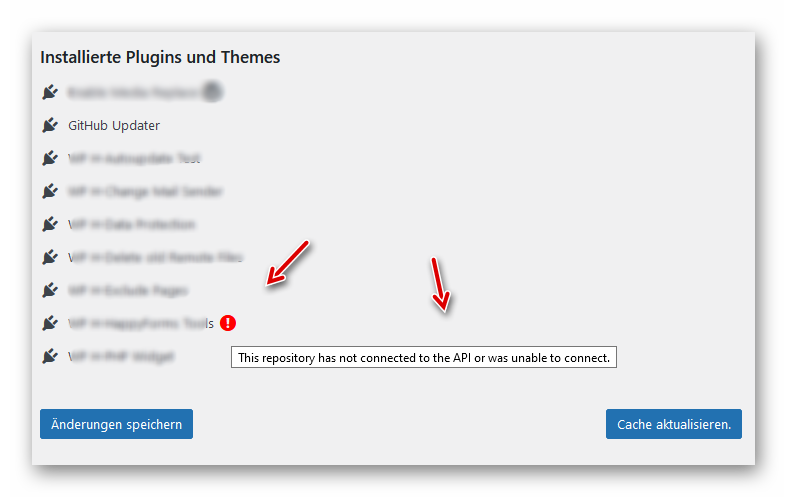 Wenn in WordPress bei den GitHub-Einstellungen ein roter Kreis zu sehen ist, kann der Updater nicht auf die Repo zugreifen. Somit sind auch keine Updates von Plugins/Themes verfügbar. Wie oben beschrieben muss der Wert von „branch“ auf „master“ geändert werden. Danach verschwindet der rote Kreis und Updates von GitHub sind wieder möglich: