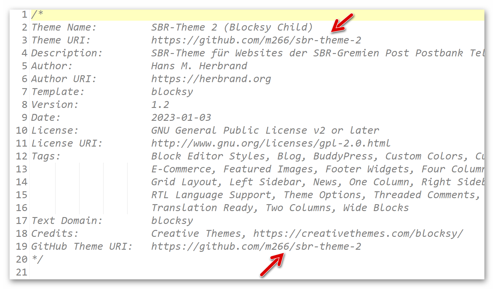 Der Link in Zeile 19 (Pfeil unten) gibt nach der URL für GitHub den Namen des Accounts auf GitHub (m266) und danach die Repository (sbr-theme-2) an.