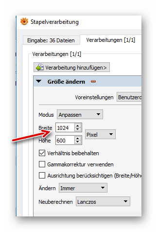 Die Bildbreite (z. B. für eine Bildergalerie) einstellen (die Bildhöhe wird automatisch angepasst). Dann auf “Schließen” klicken: