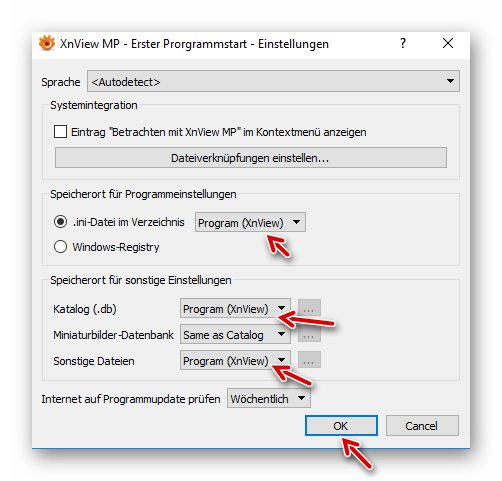 …und die markierten Einstellungen vornehmen (Damit werden von XnView MP keine Programmeinstellungen usw. auf dem verwendeten PC gespeichert). Nach Klick auf OK…
