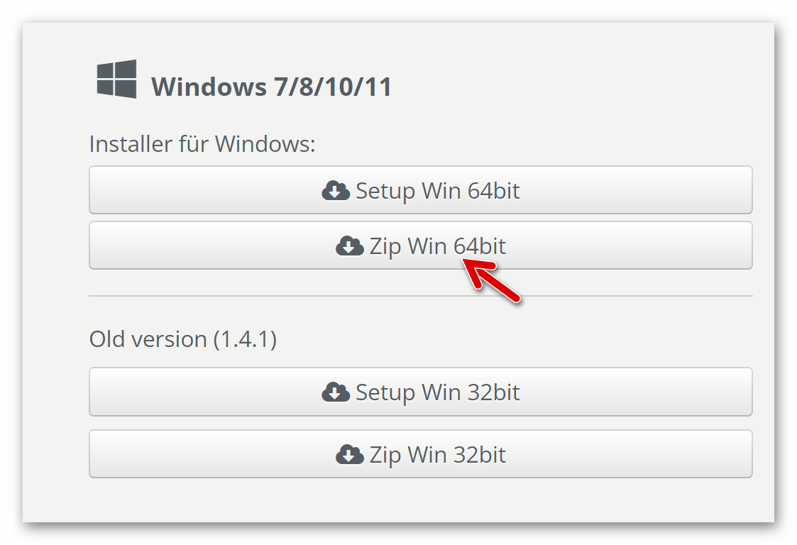 Zunächst wird die Software von dieser Seite im erforderlichen Format (Windows 32/64Bit) geladen.