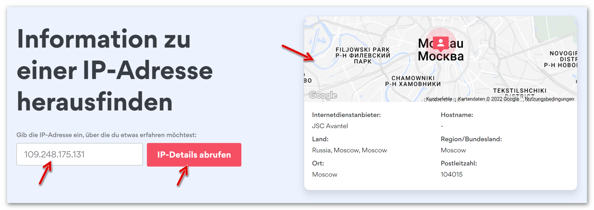 Danach geben wir die IP-Adresse, beispielsweise aus Meldungen der Firewall, ein.