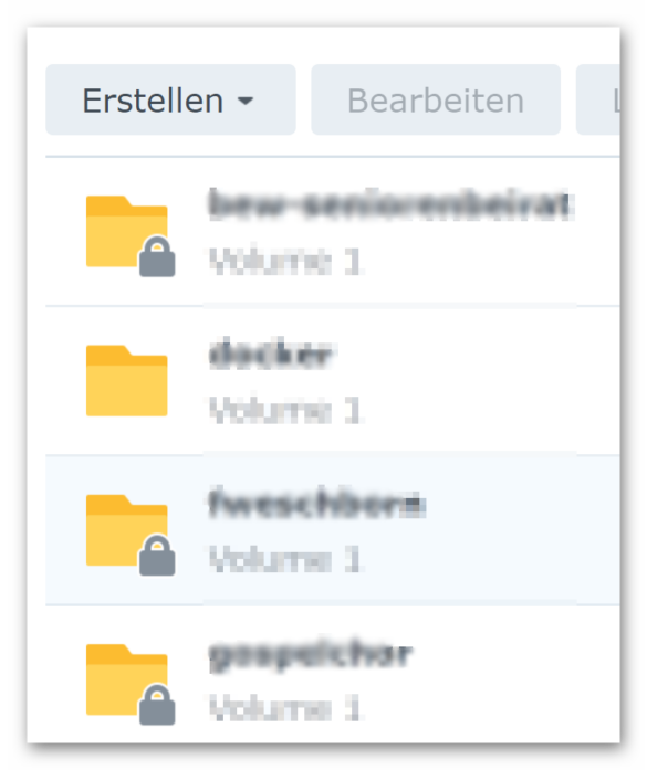 Unter Systemsteuerung -> Freigegebene Ordner sehen wir in einer Auflistung alle Ordner mit einem geschlossenen Schloss-Symbol. Sie sind verschlüsselt und werden in der File Station nicht angezeigt:
