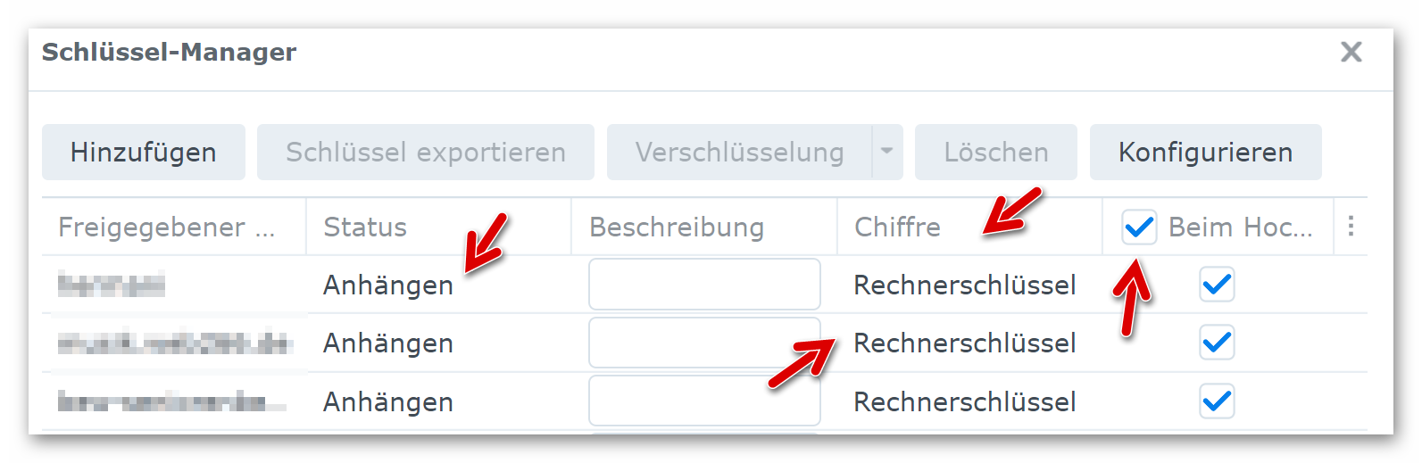 Laufwerke werden nach einem Reboot nur automatisch eingehängt, wenn im Schlüssel-Manager unter „Chiffre“ der Eintrag „Rechnerschlüssel“ gewählt bzw. eingerichtet wurde: