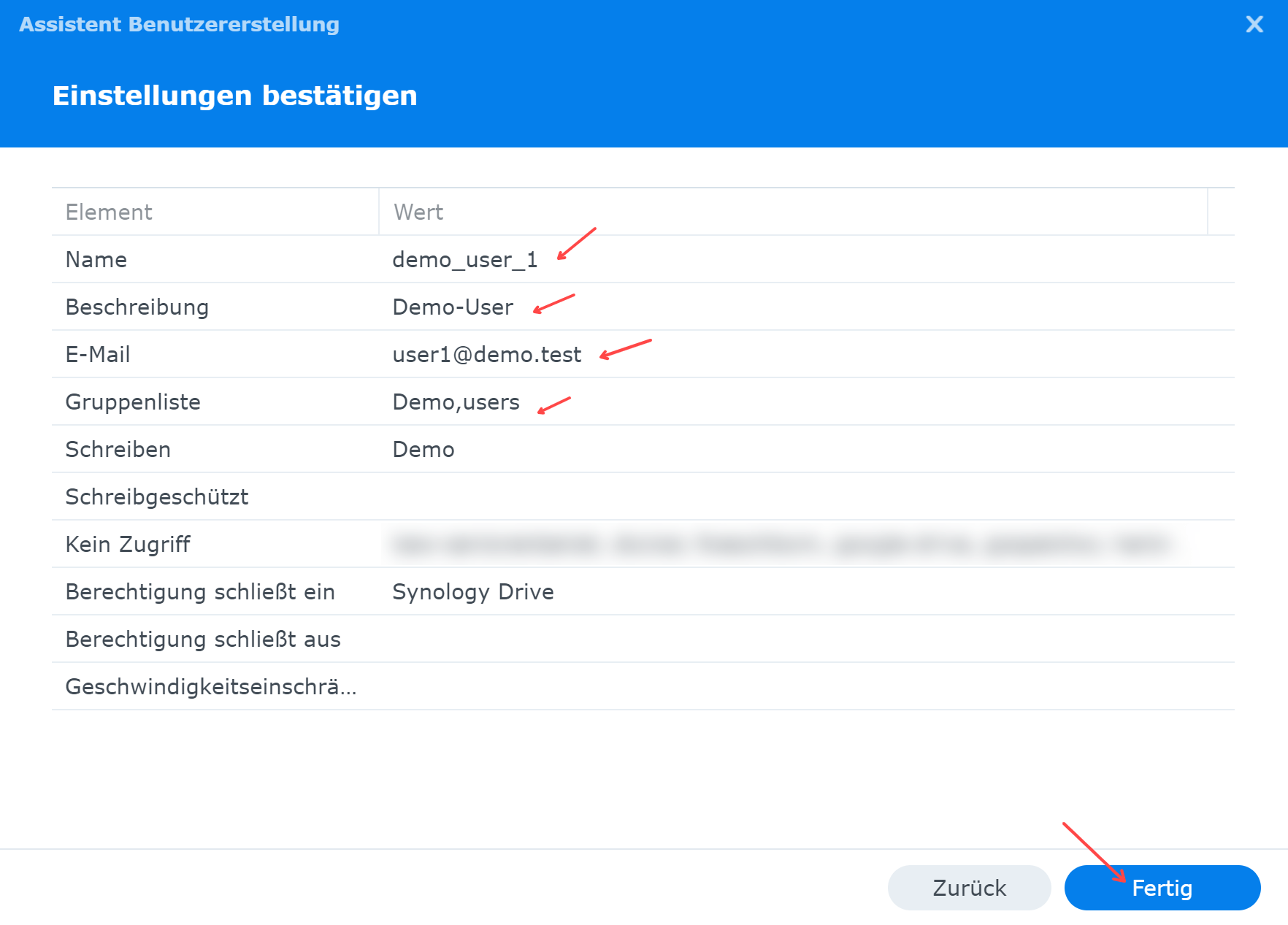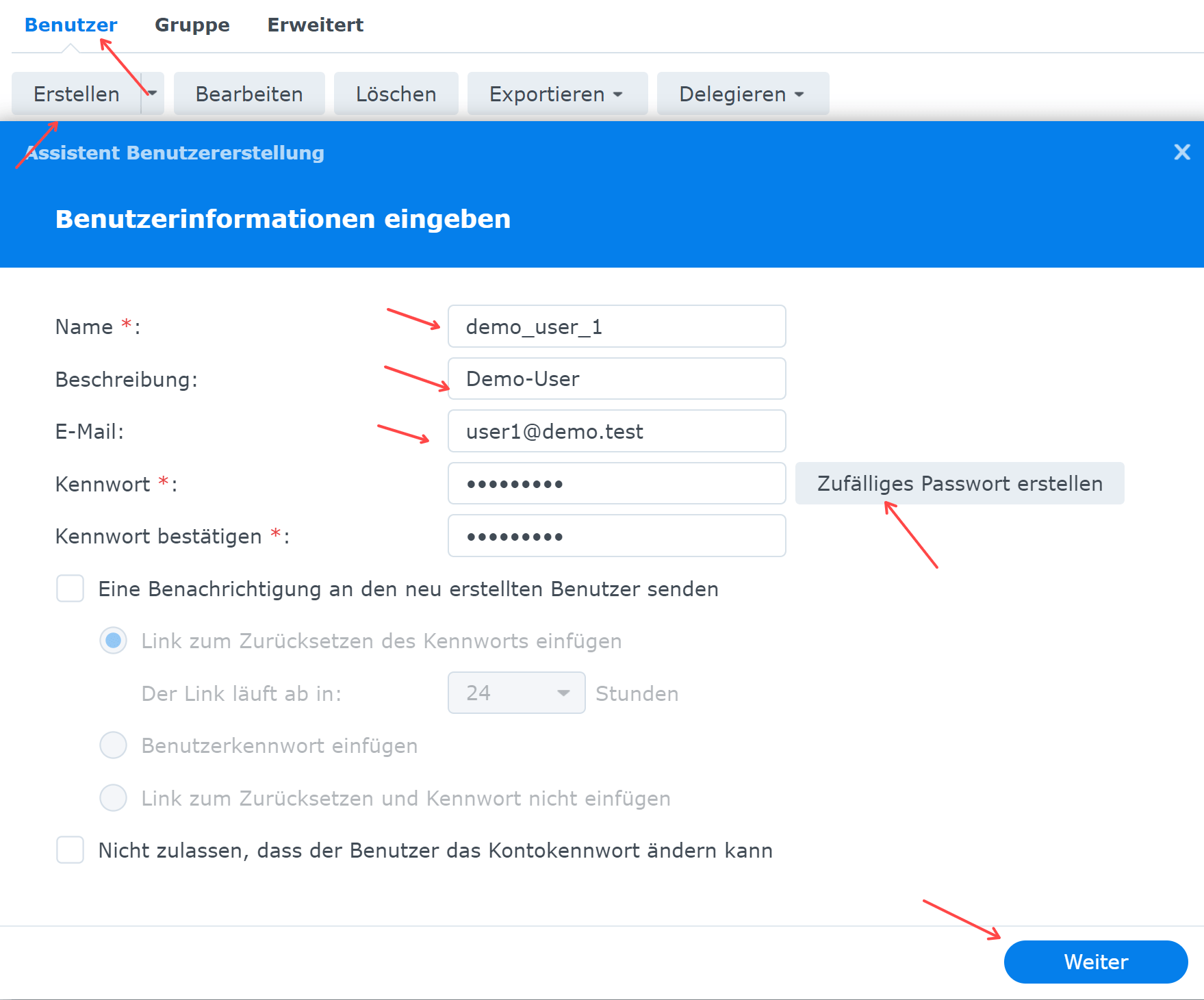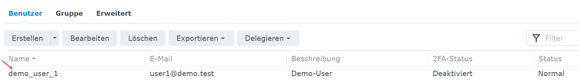 Benutzer anlegen Start Tutorials NAS Synology Synology Drive Benutzer anlegen Der Beispiel-Benutzer „demo_user_1 wird wie gezeigt angelegt: