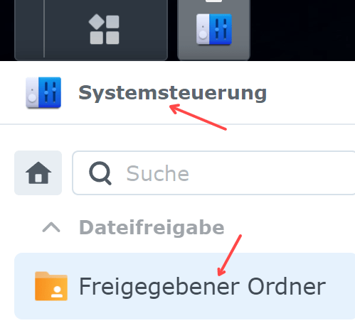 Nach dem Einloggen in die Synology klicken wir auf Systemsteuerung -> Freigegebener Ordner:
