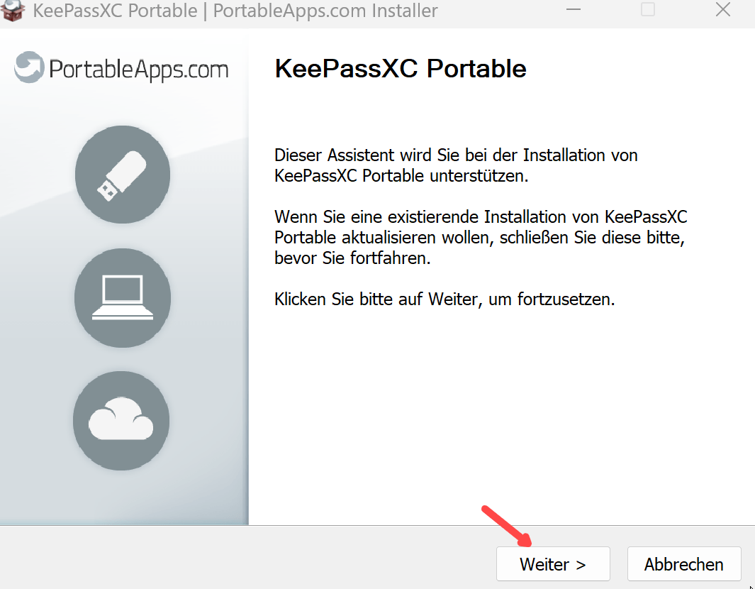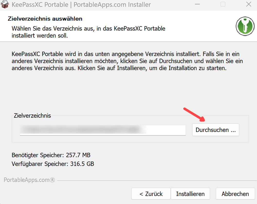 Als Zielverzeichnis das bisherige Verzeichnis der Portable Version auswählen: