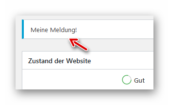 Der nachfolgende Beispielcode wird in ein Plugin oder Theme (functions.php) im PHP-Bereich eingefügt und zeigt dann die gewünschte Meldung an. Der Präfix der Funktion (hier: my_) MUSS jeweils eindeutig sein und sollte mit dem Kürzel bereits auf die Art der Admin notice hinweisen.