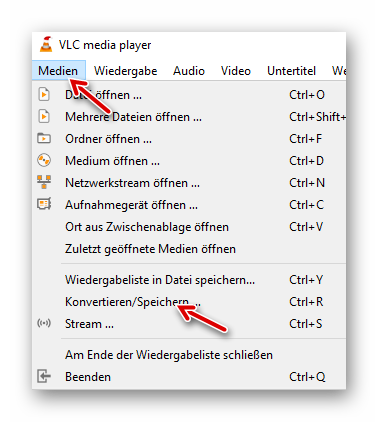 Wir starten den VLC-Player, klicken auf Medien -> Konvertieren/Speichern: