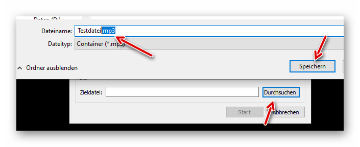 Wir klicken auf “Durchsuchen” und ergänzen beim Dateinamen die Endung mit “.mp3”. Dann auf “Speichern” klicken: