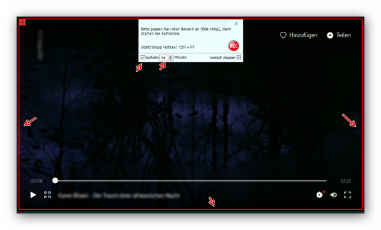 Der rote Rahmen wird auf die benötigte Größe (ganzer Bildschirm) aufgezogen und die Dauer des Films zzgl. 1 Minute eingetragen, damit die Aufnahme automatisch beendet wird: