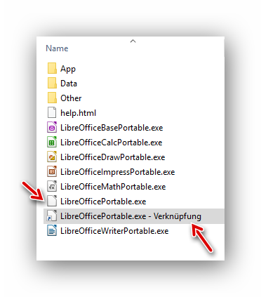 Als Beispiel wird LibreOffice (Portable Version) verwendet. Wir öffnen den Programm-Ordner und erstellen aus der Startdatei (hier LibreOfficePortable.exe) eine Verknüpfung: