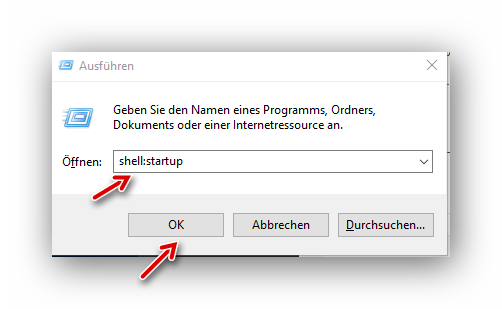 Danach die Windows-Taste und “R” gleichzeitig drücken. Im Feld “Öffnen” wird der Eintrag “shell:startup” hinzugefügt; auf OK klicken: