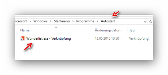 Der Autostart-Ordner öffnet sich und wir sehen einen bereits vorhandenen Eintrag (Wunderlist):
